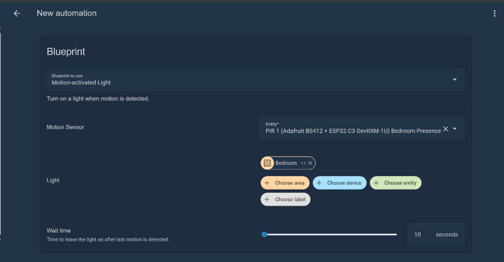 I went to add the automation, and discovered Home Assistant already comes with an inbuilt automation for "Motion-activated lights". I tried to use this at first.