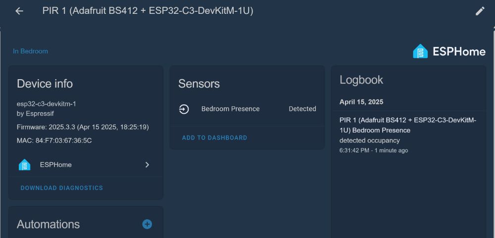 The final piece was to hook it up with Home Assistant. To do this, I went to Home Assistant's Settings -> Devices. The newly added ESPHome device had been discovered, so I clicked Add, assigned it to my Bedroom, and we were ready.
